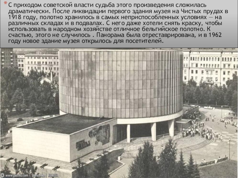 первого здания музея на Чистых прудах в 1918 году, полотно хранилось в самых неприспособленных условиях — на различных складах и в подвалах. С него даже хотели снять краску, чтобы использовать в народном хозяйстве отличное бельгийское полотно. К счастью, этого не случилось . Панорама была отреставрирована, и в 1962 году новое здание музея открылось для посетителей.