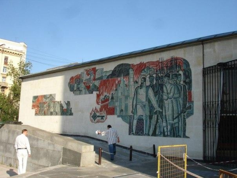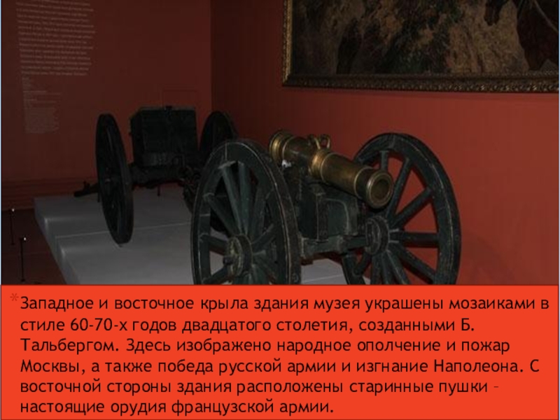 годов двадцатого столетия, созданными Б.Тальбергом. Здесь изображено народное ополчение и пожар Москвы, а также победа русской армии и изгнание Наполеона. С восточной стороны здания расположены старинные пушки – настоящие орудия французской армии.