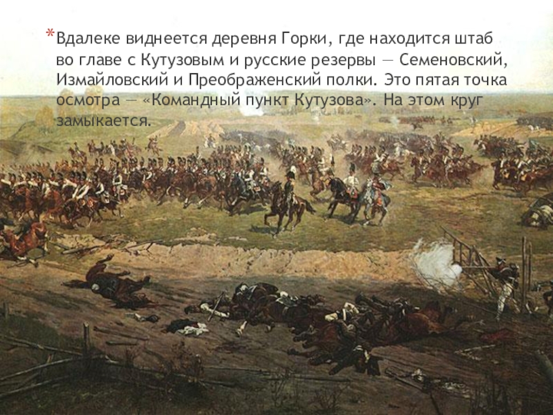 Слайд 12Вдалеке виднеется деревня Горки, где находится штаб во главе с Кутузовым