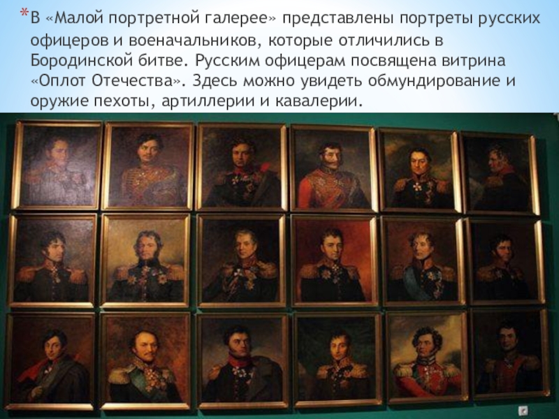 Слайд 15В «Малой портретной галерее» представлены портреты русских офицеров и военачальников, которые
