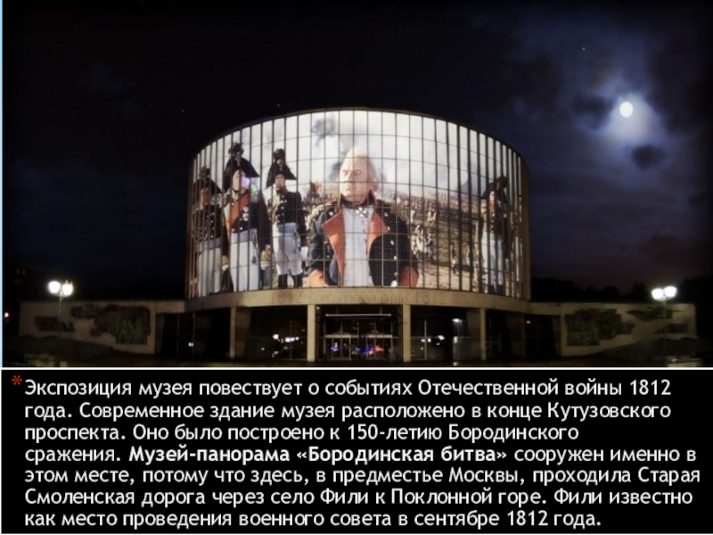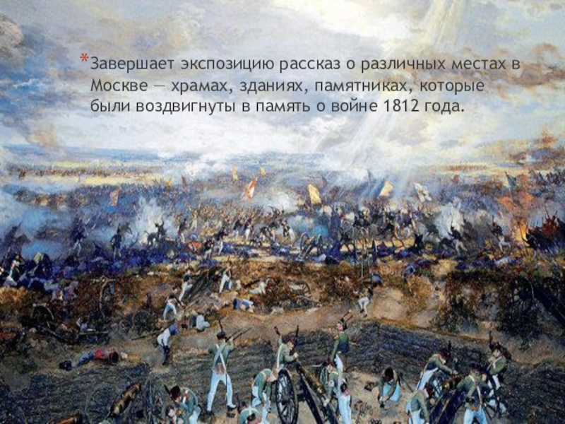 Слайд 2Экспозиция музея повествует о событиях Отечественной войны 1812 года. Современное здание