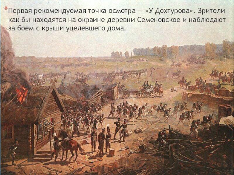 Слайд 8Первая рекомендуемая точка осмотра — «У Дохтурова». Зрители как бы находятся
