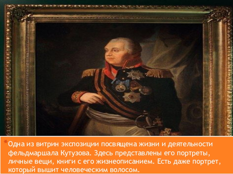 Слайд 14Одна из витрин экспозиции посвящена жизни и деятельности фельдмаршала Кутузова. Здесь