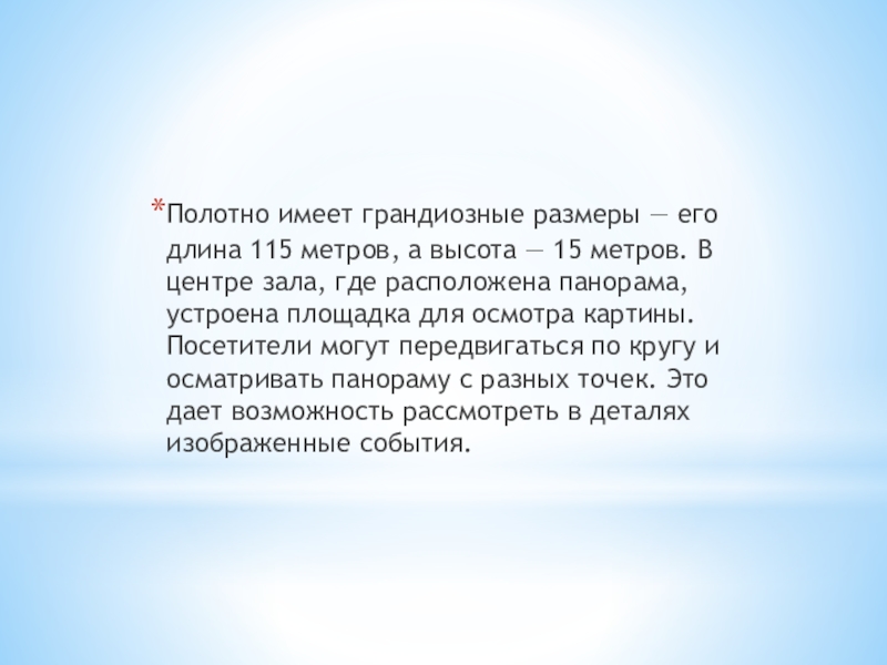 — 15 метров. В центре зала, где расположена панорама, устроена площадка для осмотра картины. Посетители могут передвигаться по кругу и осматривать панораму с разных точек. Это дает возможность рассмотреть в деталях изображенные события.