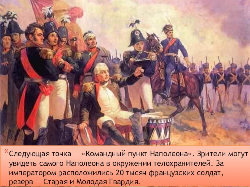 Слайд 10Следующая точка — «Командный пункт Наполеона». Зрители могут увидеть самого Наполеона