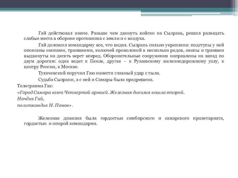 «В сентябре 1918-го дивизия занимает Симбирск. Гай, разработавший эту операцию, телеграфирует в Москву: «Дорогой Владимир Ильич! Взятие Вашего родного города – это ответ на Вашу одну рану, а за вторую – будет Самара».