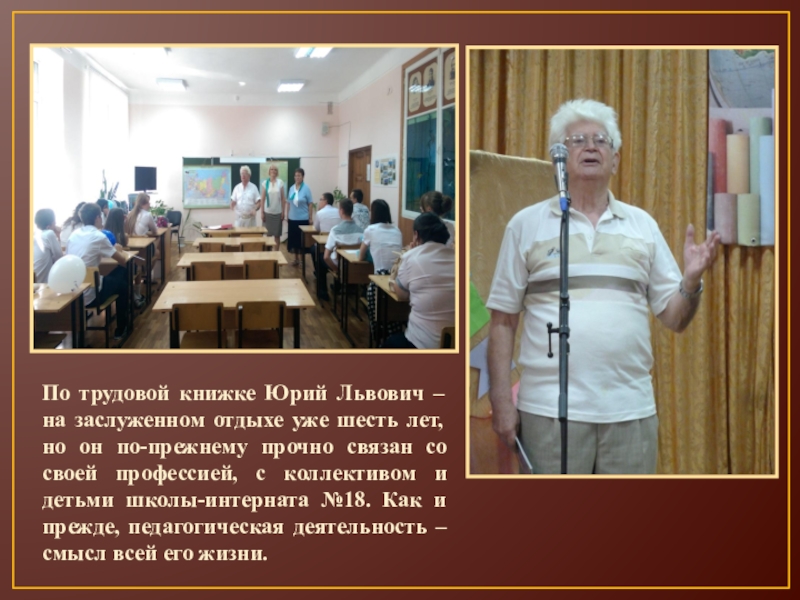 лет, но он по-прежнему прочно связан со своей профессией, с коллективом и детьми школы-интерната №18. Как и прежде, педагогическая деятельность – смысл всей его жизни.