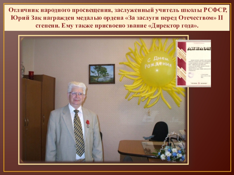 Слайд 14Отличник народного просвещения, заслуженный учитель школы РСФСР, Юрий Зак награжден медалью