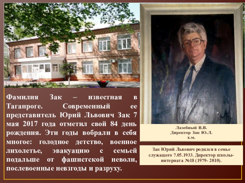 Фамилия Зак – известная в Таганроге. Современный ее представитель Юрий Львович Зак 7 мая 2017 года отметил свой 84 день рождения. Эти годы вобрали в себя многое: голодное детство, военное лихолетье, эвакуацию с семьей подальше от фашистской неволи, послевоенные невзгоды и разруху.