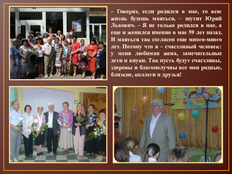 – шутит Юрий Львович. – Я не только родился в мае, а еще и женился именно в мае 59 лет назад. И маяться так согласен еще много-много лет. Потому что я – счастливый человек: у меня любимая жена, замечательные дети и внуки. Так пусть будут счастливы, здоровы и благополучны все мои родные, близкие, коллеги и друзья!