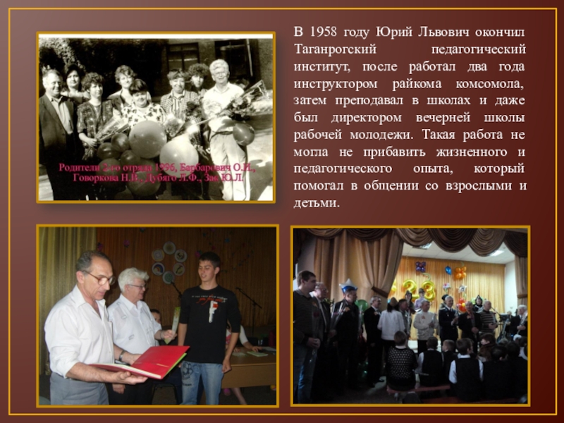 Слайд 3В 1958 году Юрий Львович окончил Таганрогский педагогический институт, после работал