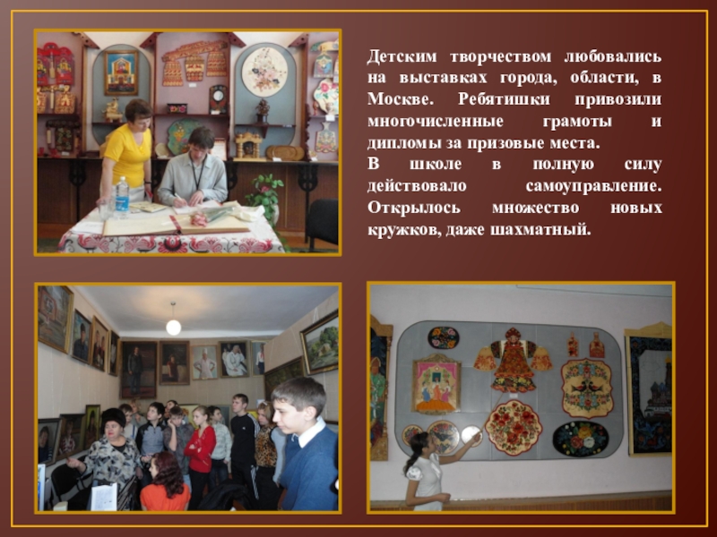 Слайд 8Детским творчеством любовались на выставках города, области, в Москве. Ребятишки привозили