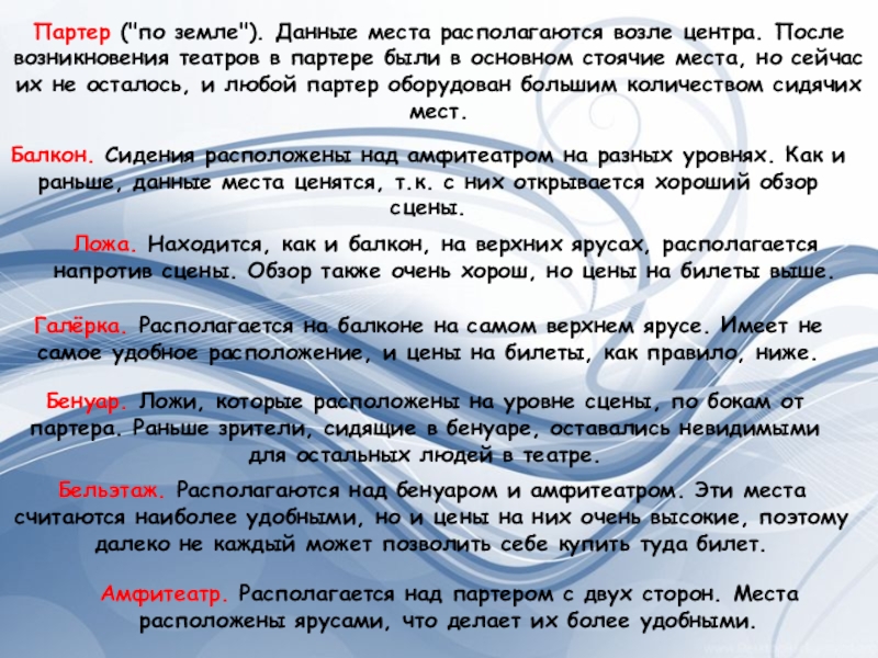 Бенуар. Ложи, которые расположены на уровне сцены, по бокам от партера. Раньше зрители, сидящие в бенуаре, оставались невидимыми для остальных людей в театре.