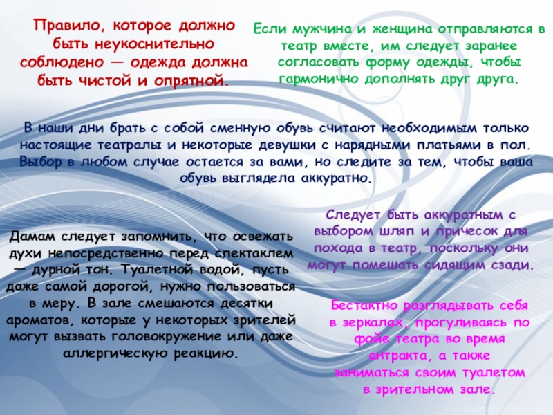 Дамам следует запомнить, что освежать духи непосредственно перед спектаклем — дурной тон. Туалетной водой, пусть даже самой дорогой, нужно пользоваться в меру. В зале смешаются десятки ароматов, которые у некоторых зрителей могут вызвать головокружение или даже аллергическую реакцию.