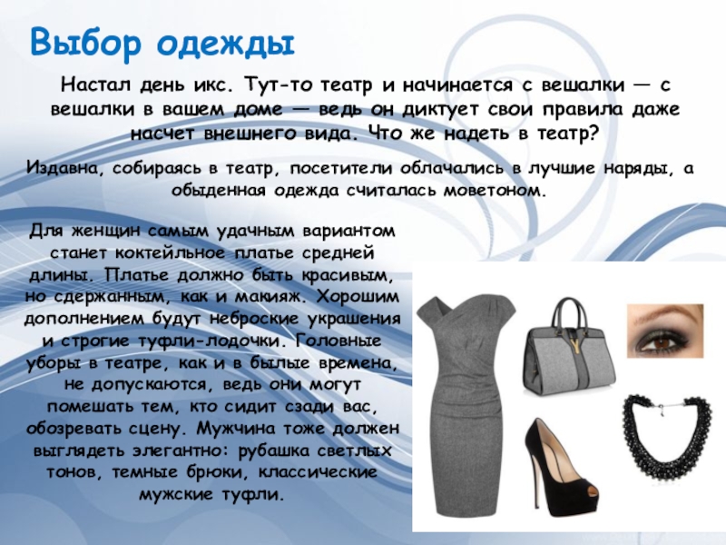 Для женщин самым удачным вариантом станет коктейльное платье средней длины. Платье должно быть красивым, но сдержанным, как и макияж. Хорошим дополнением будут неброские украшения и строгие туфли-лодочки. Головные уборы в театре, как и в былые времена, не допускаются, ведь они могут помешать тем, кто сидит сзади вас, обозревать сцену. Мужчина тоже должен выглядеть элегантно: рубашка светлых тонов, темные брюки, классические мужские туфли.