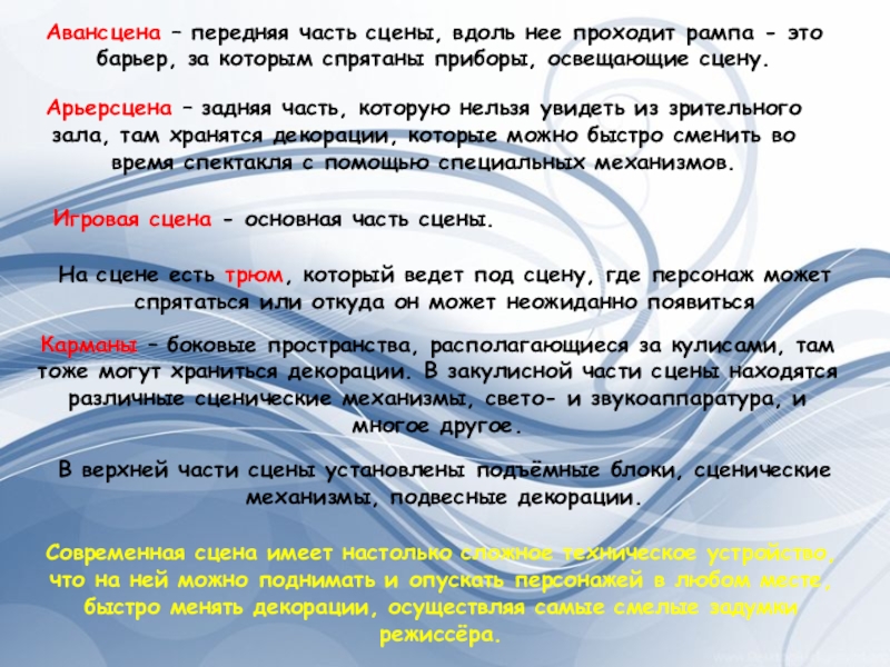Арьерсцена – задняя часть, которую нельзя увидеть из зрительного зала, там хранятся декорации, которые можно быстро сменить во время спектакля с помощью специальных механизмов.