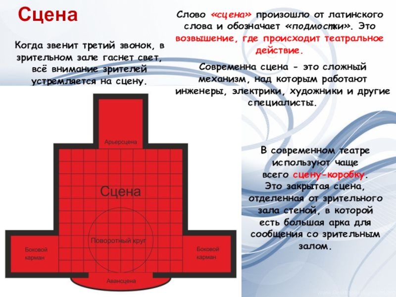 Слово «сцена» произошло от латинского слова и обозначает «подмостки». Это возвышение, где происходит театральное действие.