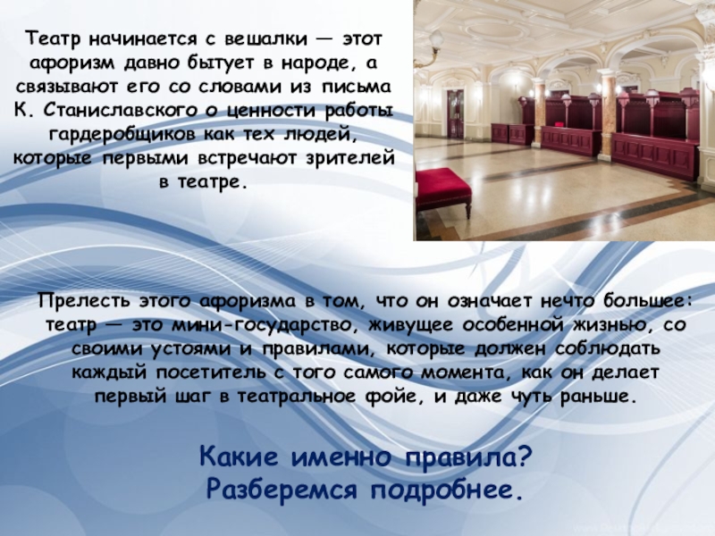 Прелесть этого афоризма в том, что он означает нечто большее: театр — это мини-государство, живущее особенной жизнью, со своими устоями и правилами, которые должен соблюдать каждый посетитель с того самого момента, как он делает первый шаг в театральное фойе, и даже чуть раньше.