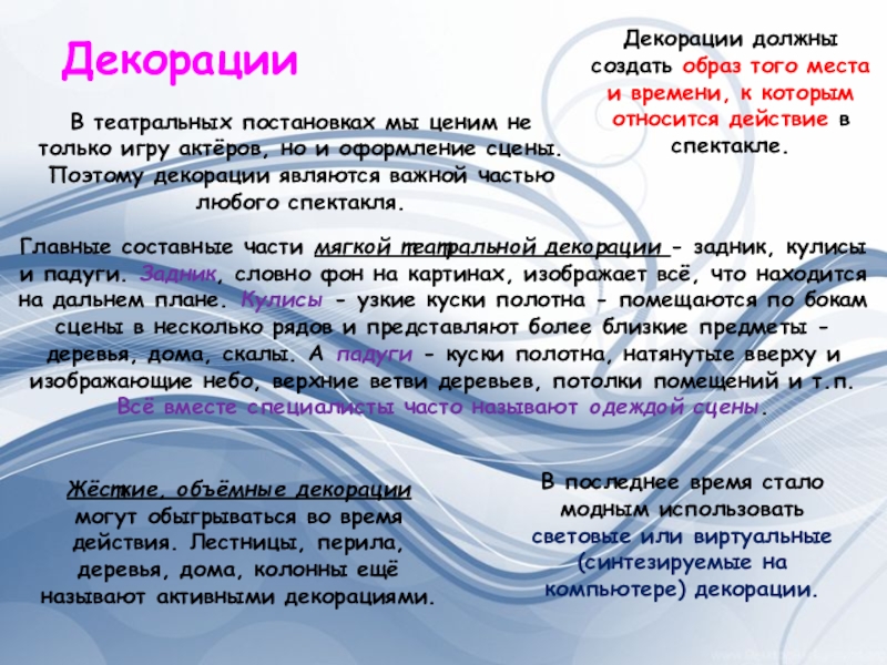 Декорации должны создать образ того места и времени, к которым относится действие в спектакле.