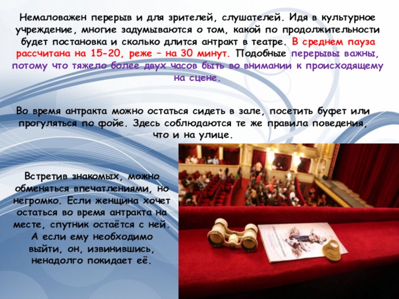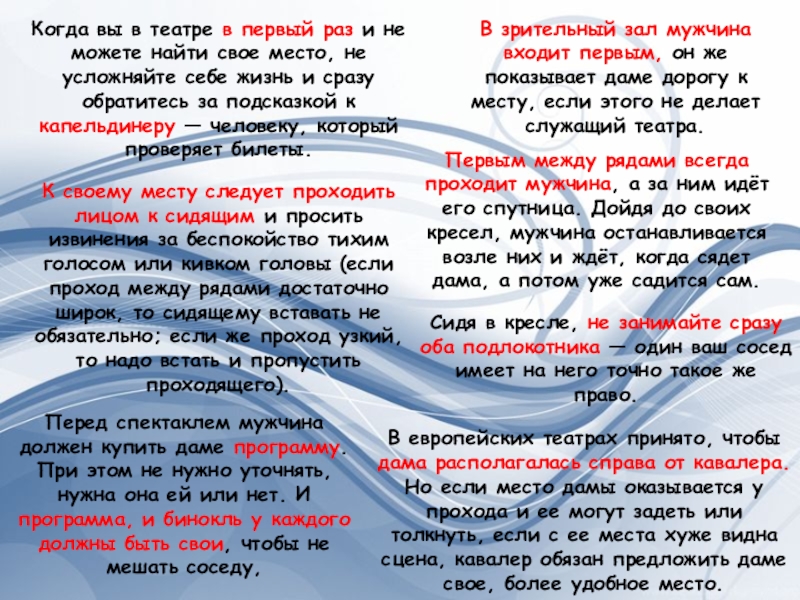 Перед спектаклем мужчина должен купить даме программу. При этом не нужно уточнять, нужна она ей или нет. И программа, и бинокль у каждого должны быть свои, чтобы не мешать соседу,