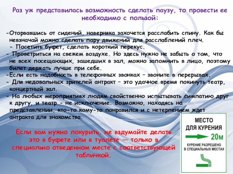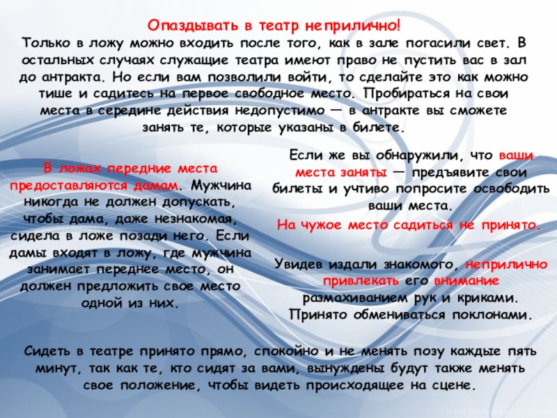 Сидеть в театре принято прямо, спокойно и не менять позу каждые пять минут, так как те, кто сидят за вами, вынуждены будут также менять свое положение, чтобы видеть происходящее на сцене.