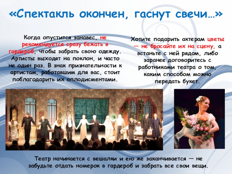 Хотите подарить актерам цветы — не бросайте их на сцену, а встаньте с ней рядом, либо заранее договоритесь с работниками театра о том, каким способом можно передать букет.