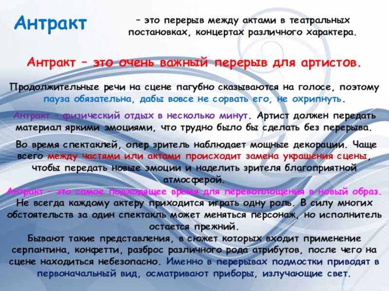 Антракт – физический отдых в несколько минут. Артист должен передать материал яркими эмоциями, что трудно было бы сделать без перерыва.