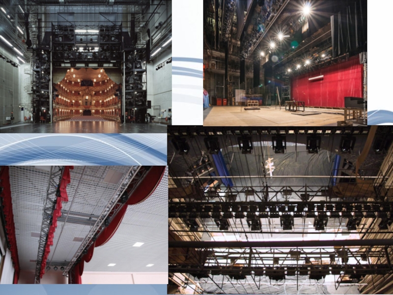 В верхней части сцены установлены подъёмные блоки, сценические механизмы, подвесные декорации.
