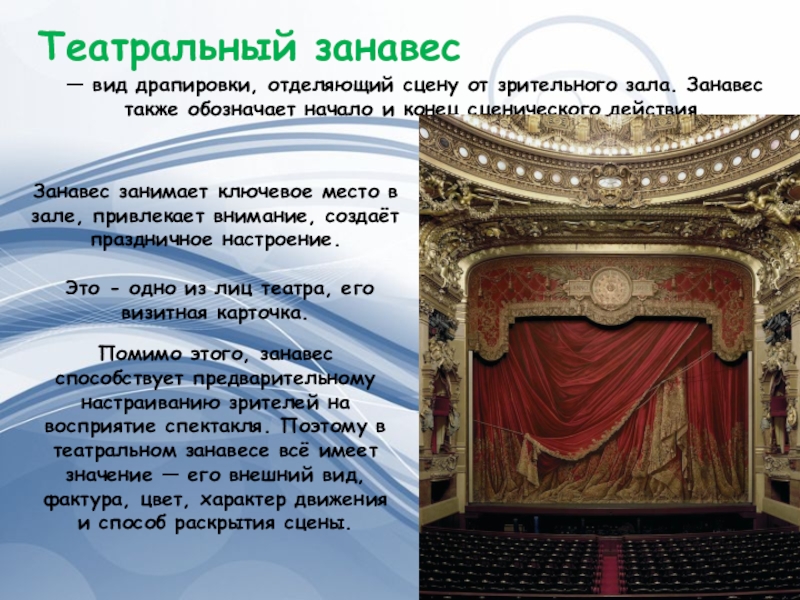 Помимо этого, занавес способствует предварительному настраиванию зрителей на восприятие спектакля. Поэтому в театральном занавесе всё имеет значение — его внешний вид, фактура, цвет, характер движения и способ раскрытия сцены.