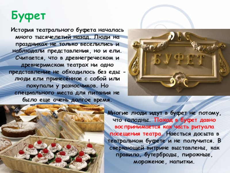 Многие люди идут в буфет не потому, что голодны. Поход в буфет давно воспринимается как часть ритуала посещения театра. Наесться досыта в театральном буфете и не получится. В сверкающей витрине выставлены, как правило, бутерброды, пирожные, мороженое, напитки.