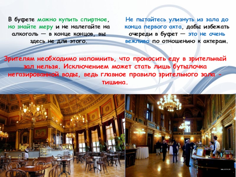 Не пытайтесь улизнуть из зала до конца первого акта, дабы избежать очереди в буфет — это не очень вежливо по отношению к актерам.