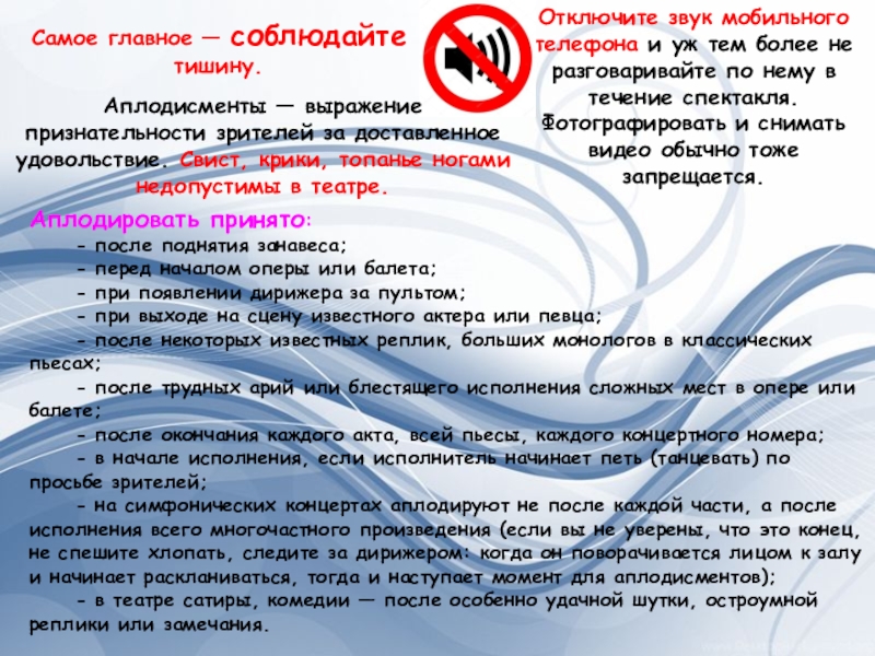 - на симфонических концертах аплодируют не после каждой части, а после исполнения всего многочастного произведения (если вы не уверены, что это конец, не спешите хлопать, следите за дирижером: когда он поворачивается лицом к залу и начинает раскланиваться, тогда и наступает момент для аплодисментов);