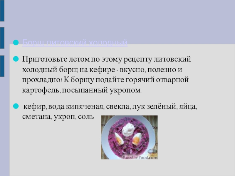 кефире - вкусно, полезно и прохладно! К борщу подайте горячий отварной картофель, посыпанный укропом.