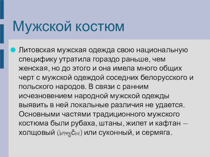 Литовская мужская одежда свою национальную специфику утратила гораздо раньше, чем