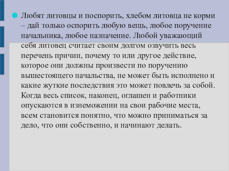 оспорить любую вещь, любое поручение начальника, любое назначение. Любой уважающий себя литовец считает своим долгом озвучить весь перечень причин, почему то или другое действие, которое они должны произвести по поручению вышестоящего начальства, не может быть исполнено и какие жуткие последствия это может повлечь за собой. Когда весь список, наконец, оглашен и работники опускаются в изнеможении на свои рабочие места, всем становится понятно, что можно приниматься за дело, что они собственно, и начинают делать.