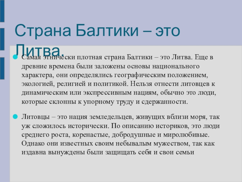 Литва. Еще в древние времена были заложены основы национального характера, они определялись географическим положением, экологией, религией и политикой. Нельзя отнести литовцев к динамическим или экспрессивным нациям, обычно это люди, которые склонны к упорному труду и сдержанности.
