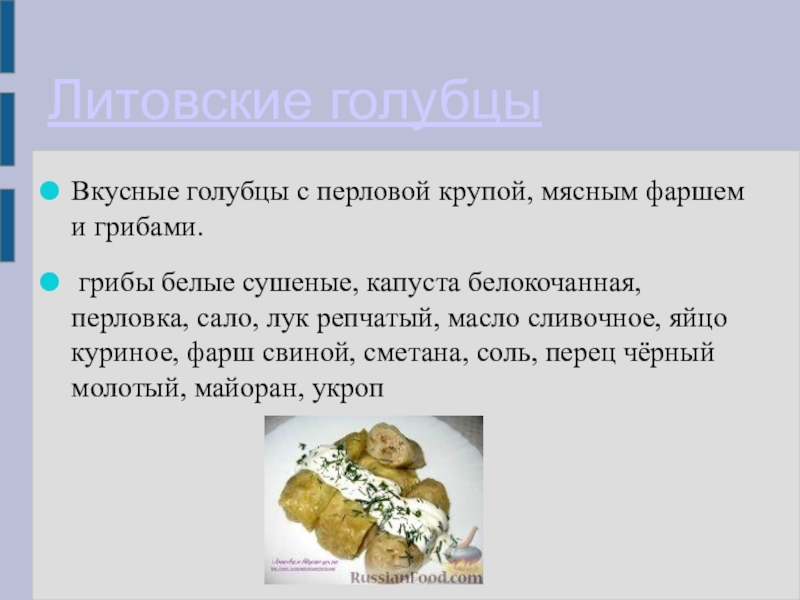 сушеные, капуста белокочанная, перловка, сало, лук репчатый, масло сливочное, яйцо куриное, фарш свиной, сметана, соль, перец чёрный молотый, майоран, укроп