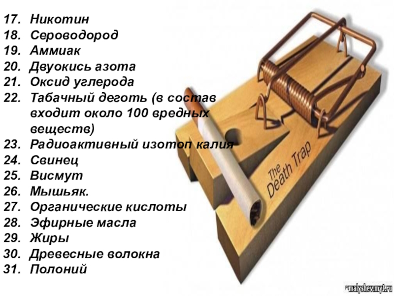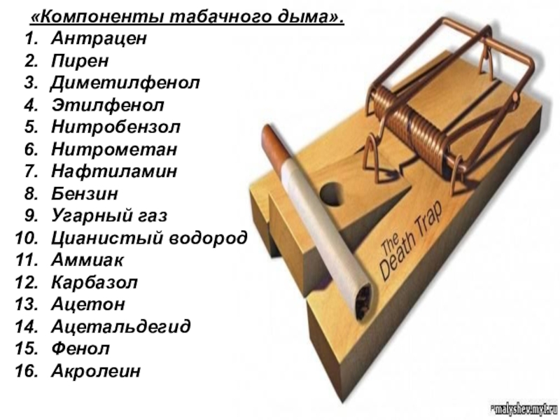 «Компоненты табачного дыма».АнтраценПиренДиметилфенолЭтилфенолНитробензолНитрометанНафтиламинБензинУгарный газЦианистый водородАммиакКарбазолАцетонАцетальдегидФенолАкролеин