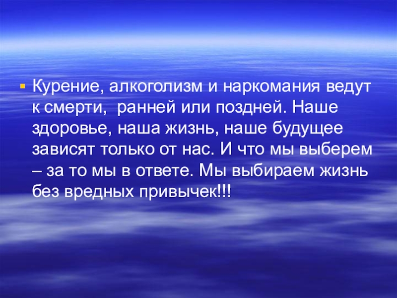 Курение, алкоголизм и наркомания ведут к смерти, ранней или поздней. Наше здоровье, наша жизнь, наше будущее зависят