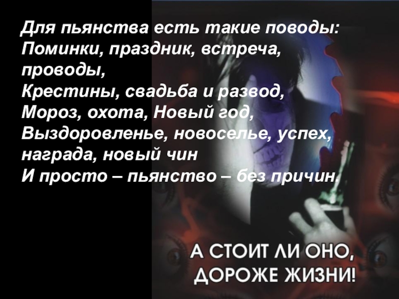 Для пьянства есть такие поводы:Поминки, праздник, встреча, проводы,Крестины, свадьба и развод,Мороз, охота, Новый год,Выздоровленье, новоселье, успех, награда,