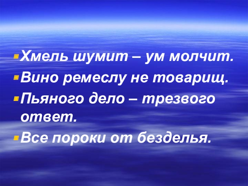 Хмель шумит – ум молчит.Вино ремеслу не товарищ.Пьяного дело – трезвого ответ.Все пороки от безделья.