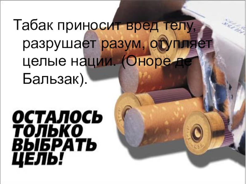 Табак приносит вред телу, разрушает разум, отупляет целые нации. (Оноре де Бальзак).