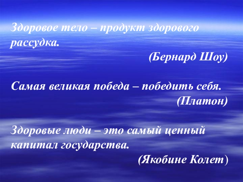 Здоровое тело – продукт здорового рассудка. (Бернард Шоу)Самая великая победа – победить себя. (Платон)Здоровые люди – это