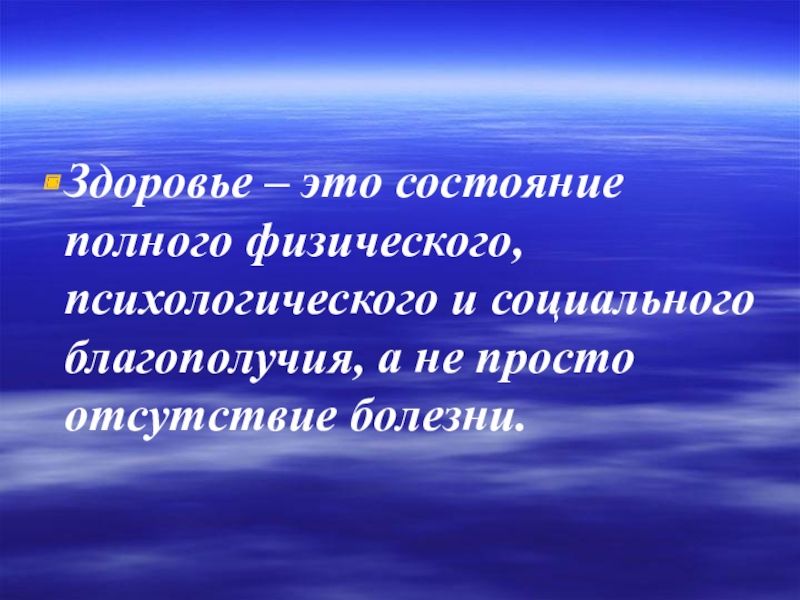 Здоровье – это состояние полного физического, психологического и социального благополучия, а не просто отсутствие болезни.
