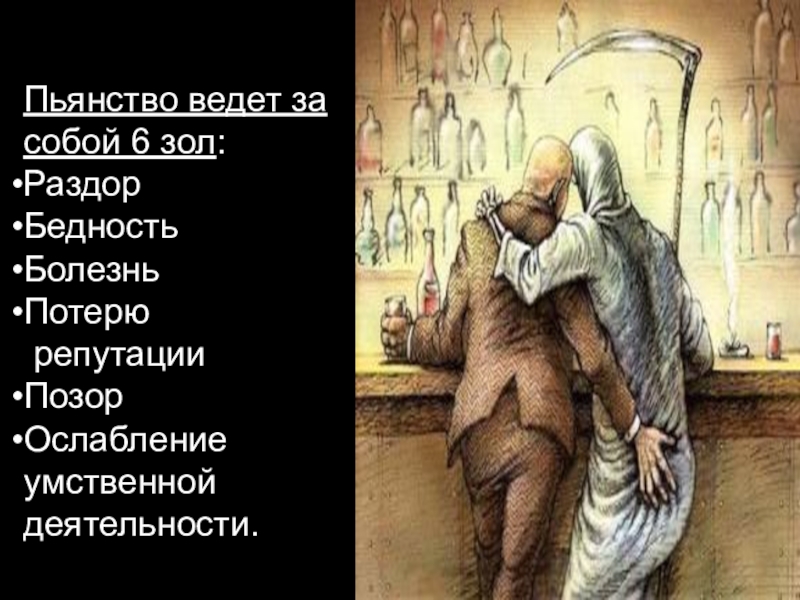 Пьянство ведет за собой 6 зол:РаздорБедность БолезньПотерю репутацииПозорОслаблениеумственной деятельности.