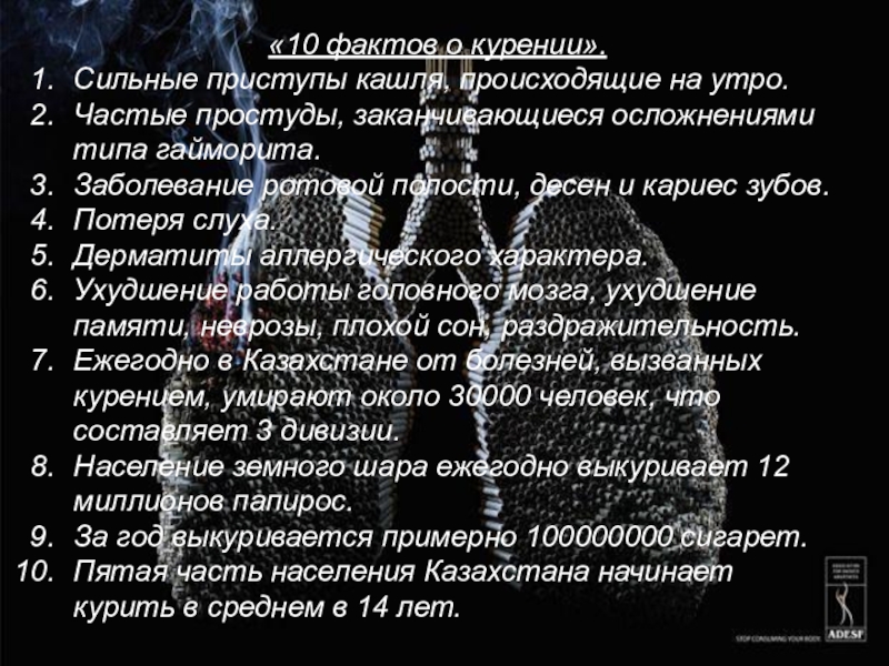 «10 фактов о курении».Сильные приступы кашля, происходящие на утро.Частые простуды, заканчивающиеся осложнениями типа гайморита.Заболевание ротовой полости, десен