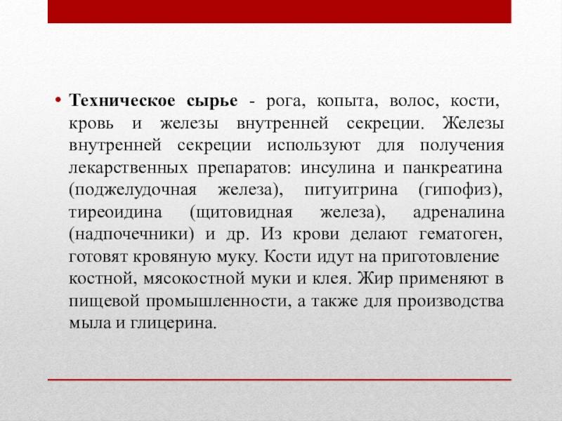 Слайд 8Техническое сырье - рога, копыта, волос, кости, кровь и железы внутренней