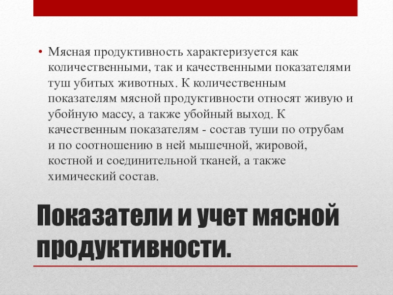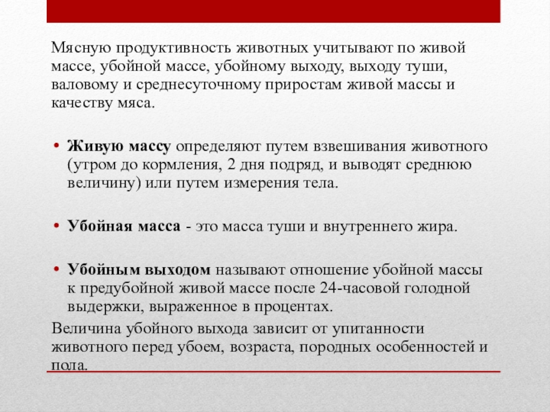 Слайд 4Мясную продуктивность животных учитывают по живой массе, убойной массе, убойному выходу,
