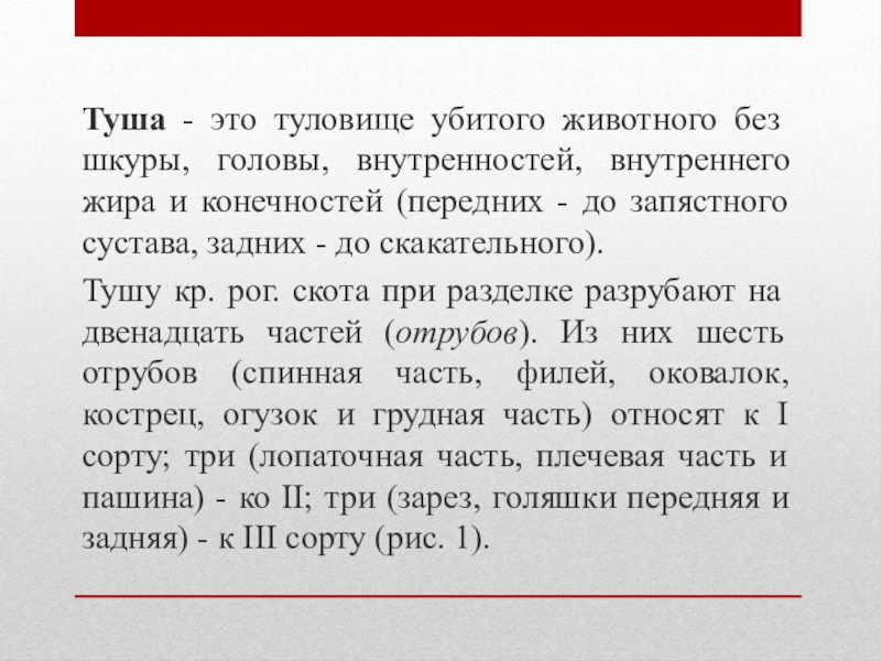 Слайд 5Туша - это туловище убитого животного без шкуры, головы, внутренностей, внутреннего