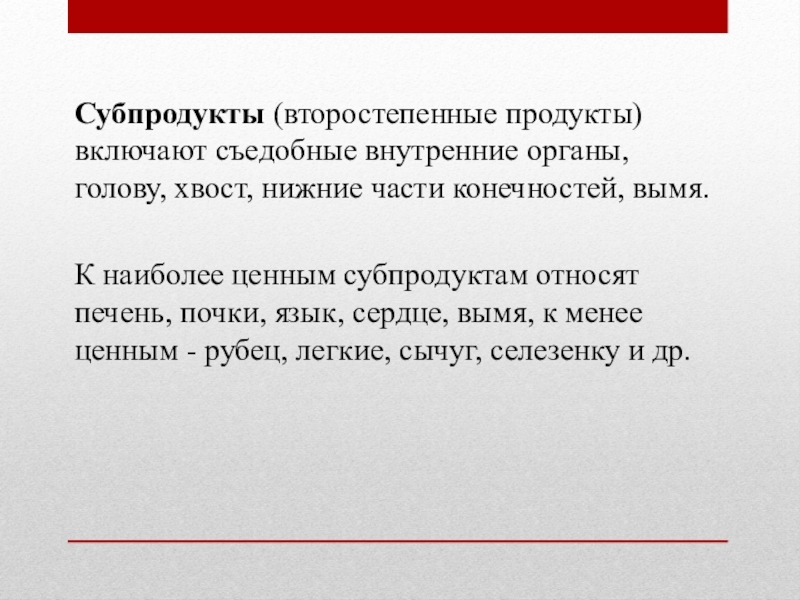 Слайд 7Субпродукты (второстепенные продукты) включают съедобные внутренние органы, голову, хвост, нижние части